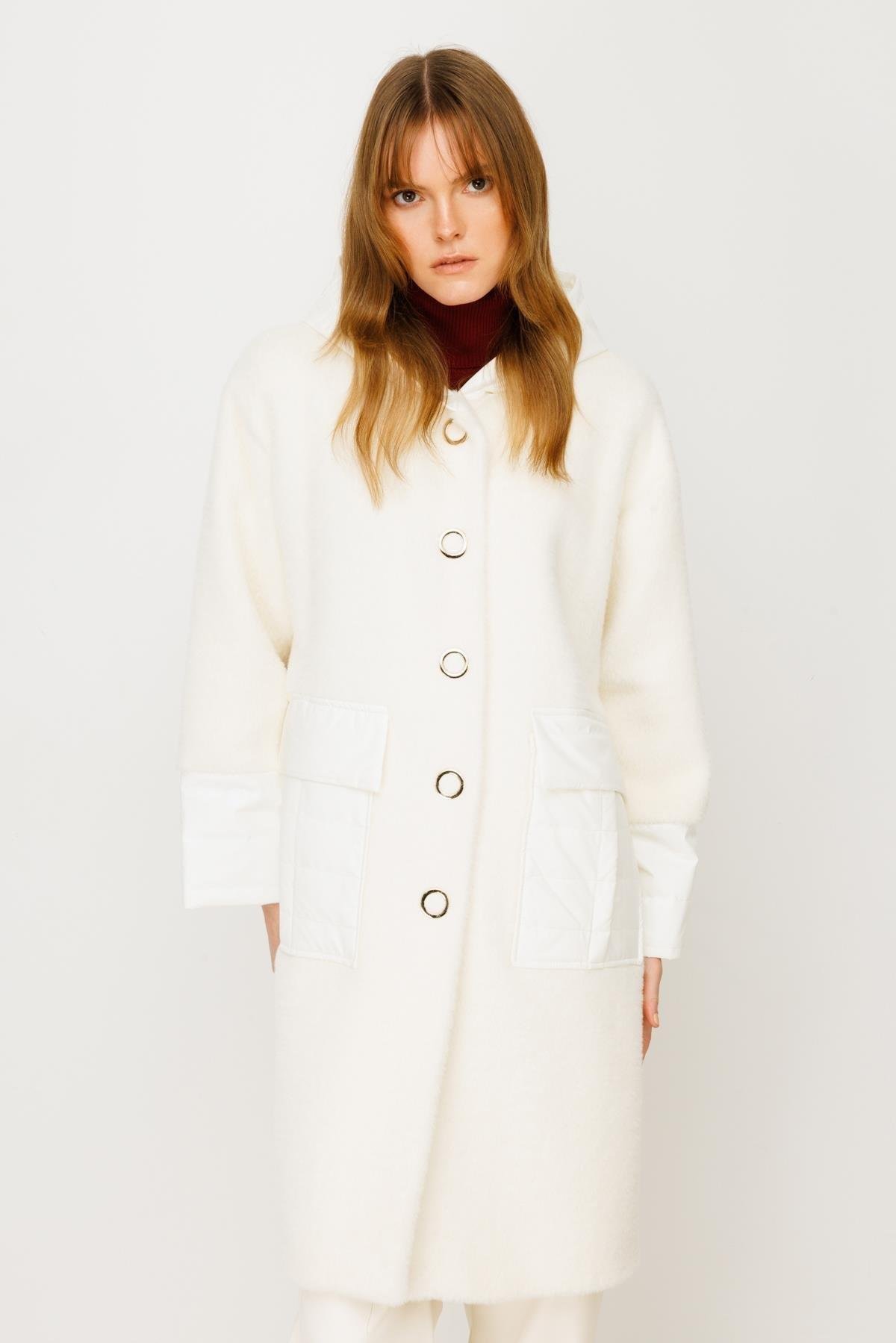 Kapitone mixli cep detaylı kapüşonlu kaban-