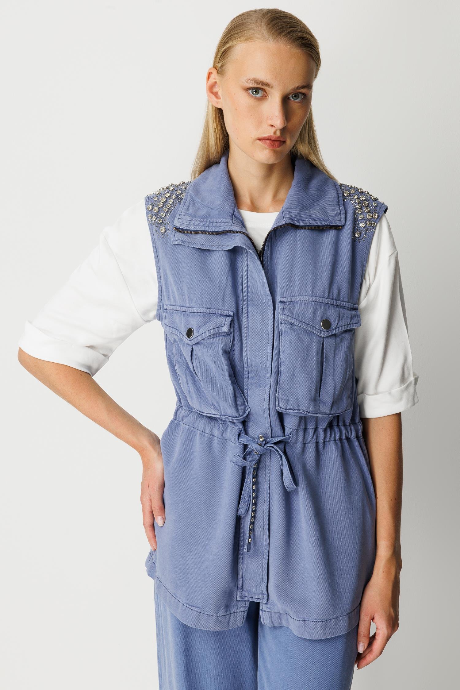Omuzları taş işleme, fermuar kapamalı, patlı, belden ayarlanabilir, cepli modal yelek-