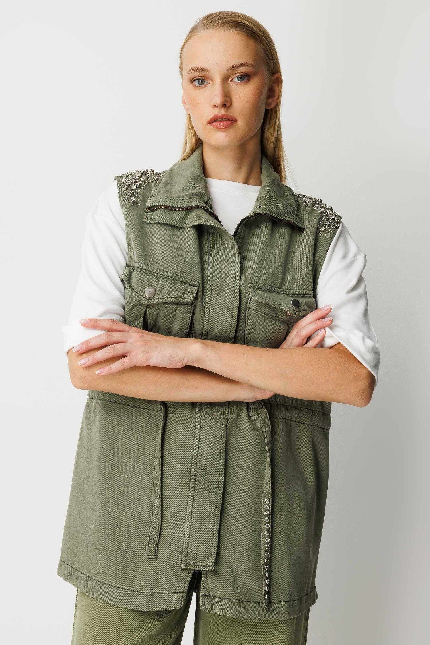 Omuzları taş işleme, fermuar kapamalı, patlı, belden ayarlanabilir, cepli modal yelek-